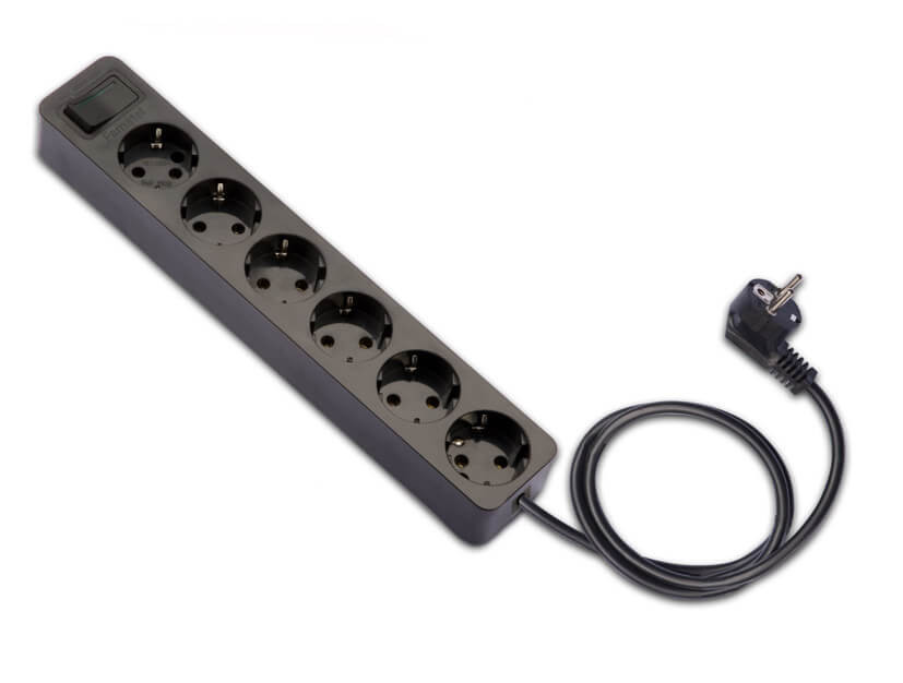 Földelt szerelt elosztó hatos /hosszanti/ 1.5m vez, kapcsolós, fekete, 16A-250V, 2518-N, Famatel S.A