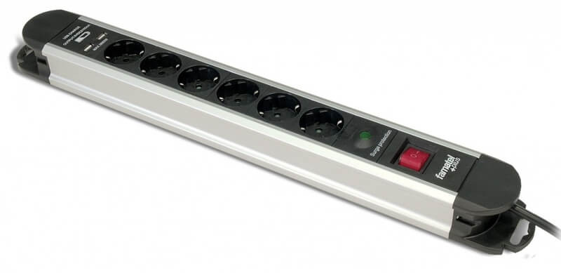 Földelt szerelt elosztó, hatos + 2db USB, kapcsolós, fekete, 22006, Famatel S.A