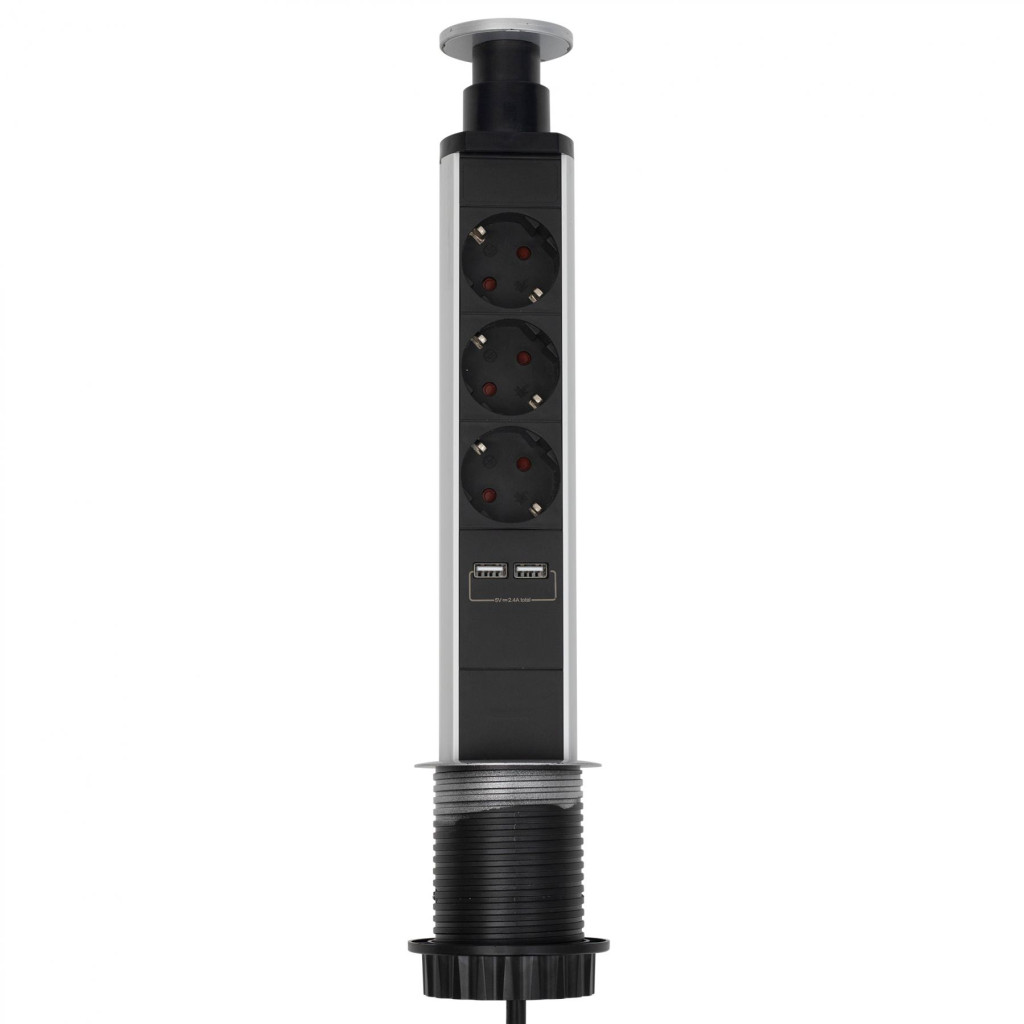 Home NVE 3/USB süllyesztett elosztó USB töltőaljzatokkal, 1,4 m, 3 földelt aljzat gyermekvédelemmel, asztalba, munkalapba építhető, süllyeszthető, max. 3680 W, NVE_3_USB